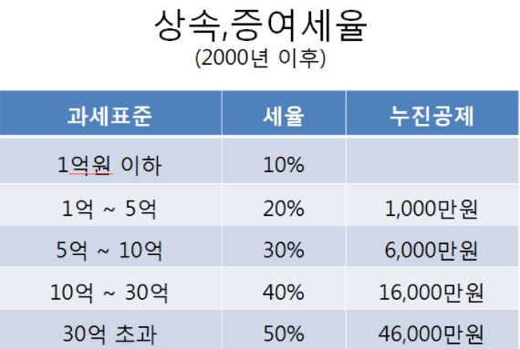 상속에 대한 세금은 위의 표와 같습니다. 만약 각종 공제(배우자 공제, 자녀공제 등등)를 제외하고 나온 산출 세액이 2억이라고 하면 내실 세금은 2억의 20%인 4천만원에서 공제 천만원을 받아 3천만원을 납부하시게 됩니다.