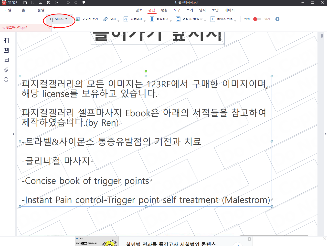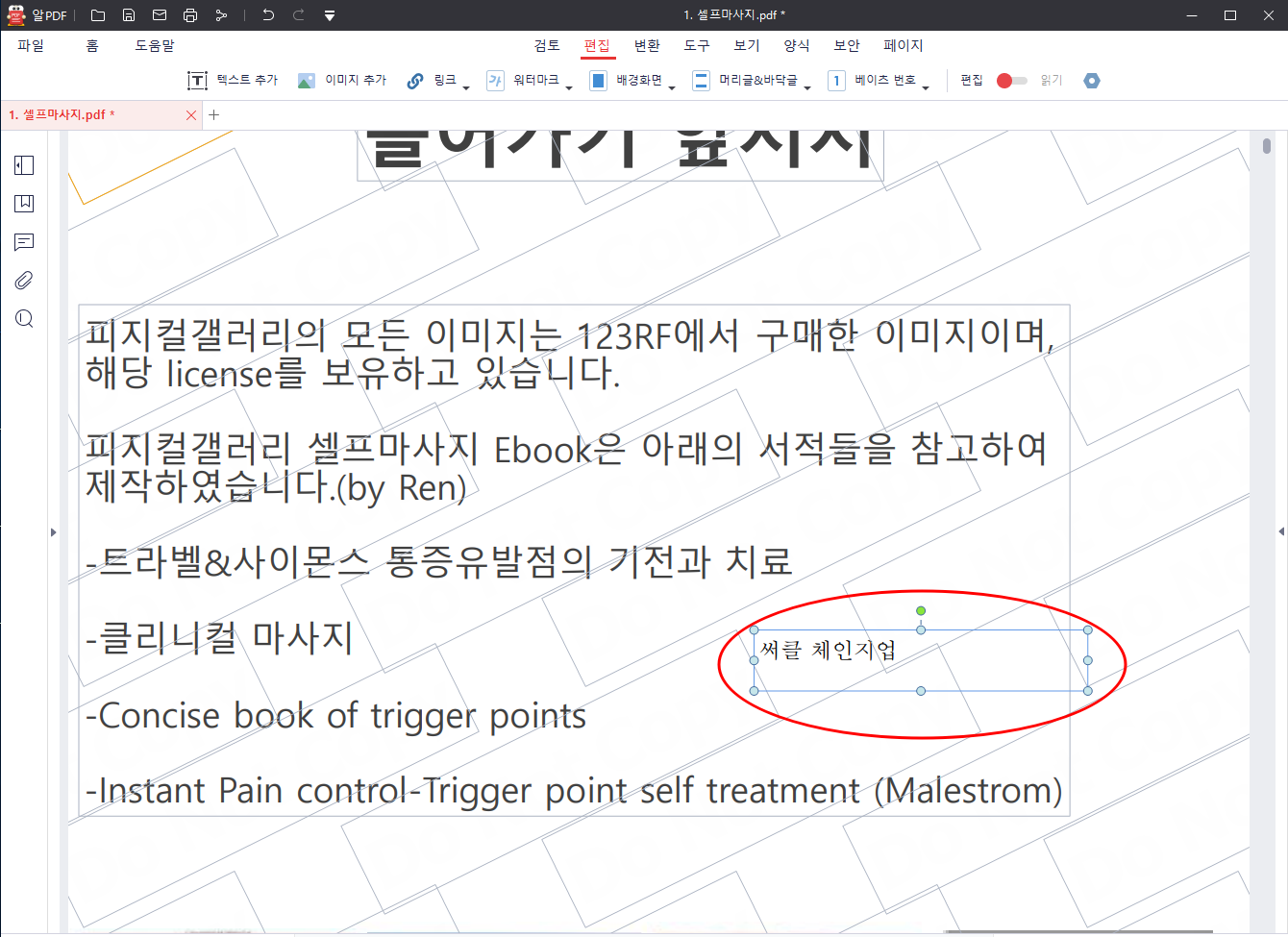 알PDF를 통해 프로그램을 열고 편집탭에서 텍스트 추가를 누르시면 해당 PDF 파일에 텍스트를 수정할 수 있습니다.