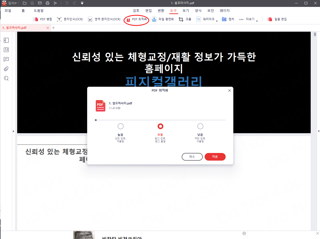 알PDF에서 가장 애용하는기능은 PDF최적화 메뉴입니다. 특정 관공서 사이트의 경우 일정용량 이상의 PDF파일이 첨부되지 않는 증상이 있는데요, 알PDF의 PDF 최적화 메뉴를 통해 파일 사이즈를 줄일 수 있습니다.