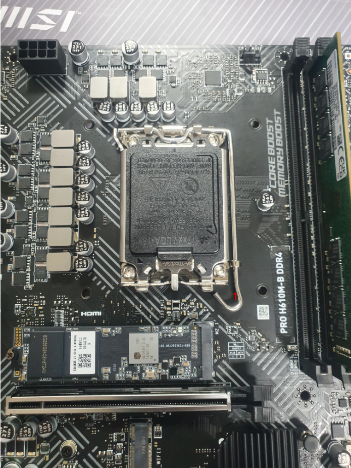 1번 걸쇠를 먼저 풀어줍니다. CPU 장착전에 M.2 램등 나머지 부품을 쿨러 장착전에 장착해주시면 간섭없이 장착 가능합니다.
