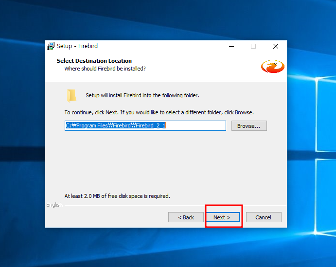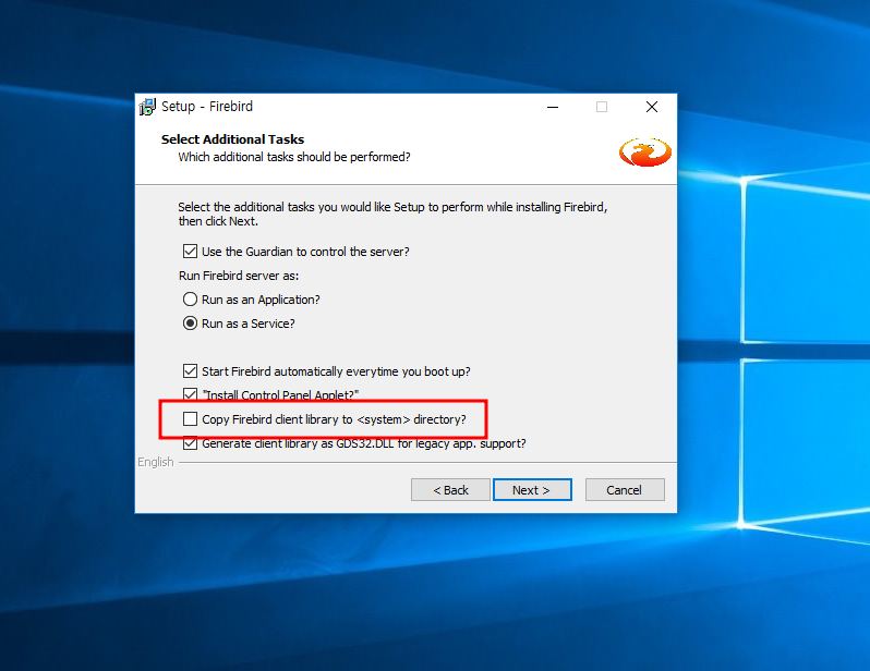 다음 설치 화면에서 COPY FIREBIRD CLIENT LIBRARY TO <SYSTEM> DIRECTORY 항목이 체크 해제 되어 있는데 이 항목을 체크 해주셔야됩니다.