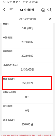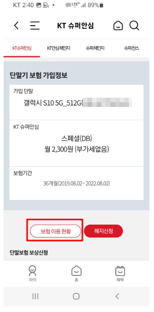 스마트폰 모델명과 가입되어 있는 보험종류, 보험 보장 기간이 나옵니다. 보험 이용 현황을 눌러보겠습니다.