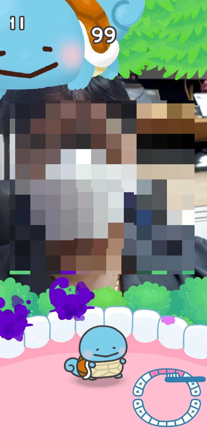 이런식으로 핸드폰을 고정시켜놓고 아이 얼굴이 나오게 한 후 치아 부위별로 양치질을 하면서 충치를 잡는 게임입니다. 약 3분정도 지속 되는 것 같구요, 시간을 잘 지키면서 충치를 열심히 잡으면 게임 후에 포켓몬을 보상으로 줍니다.