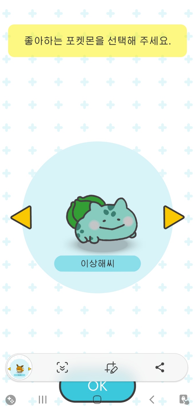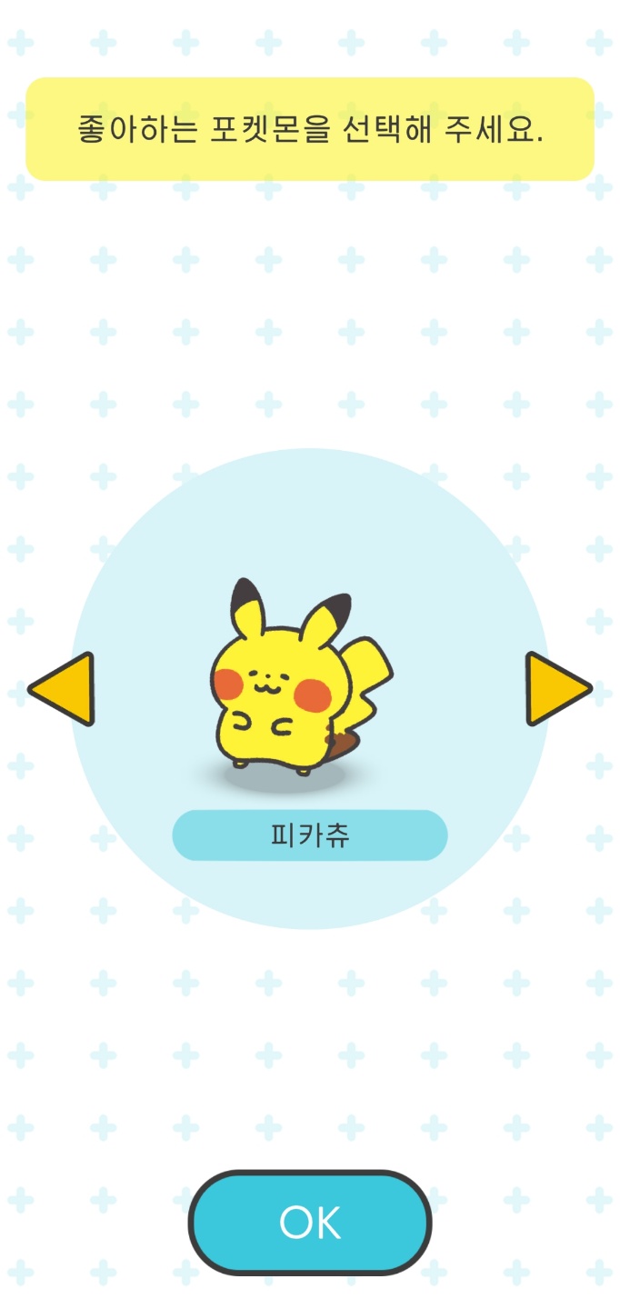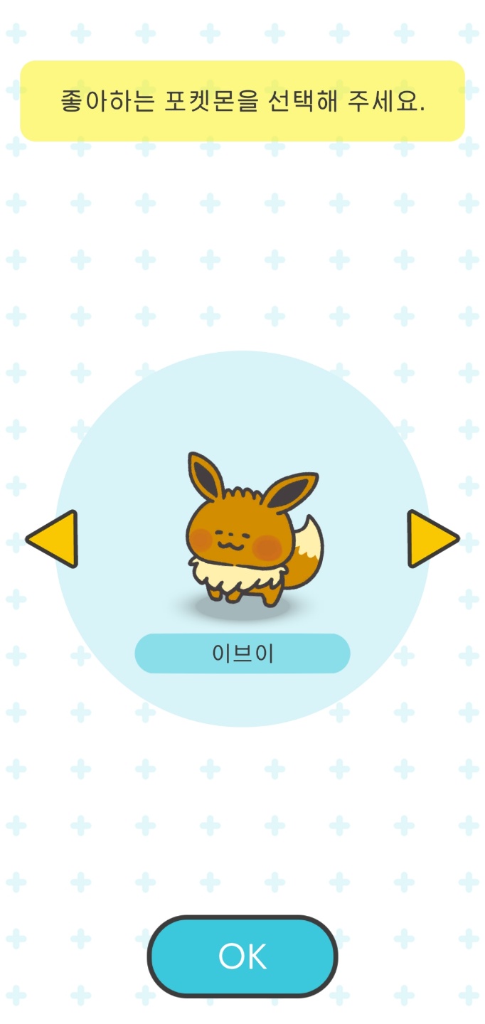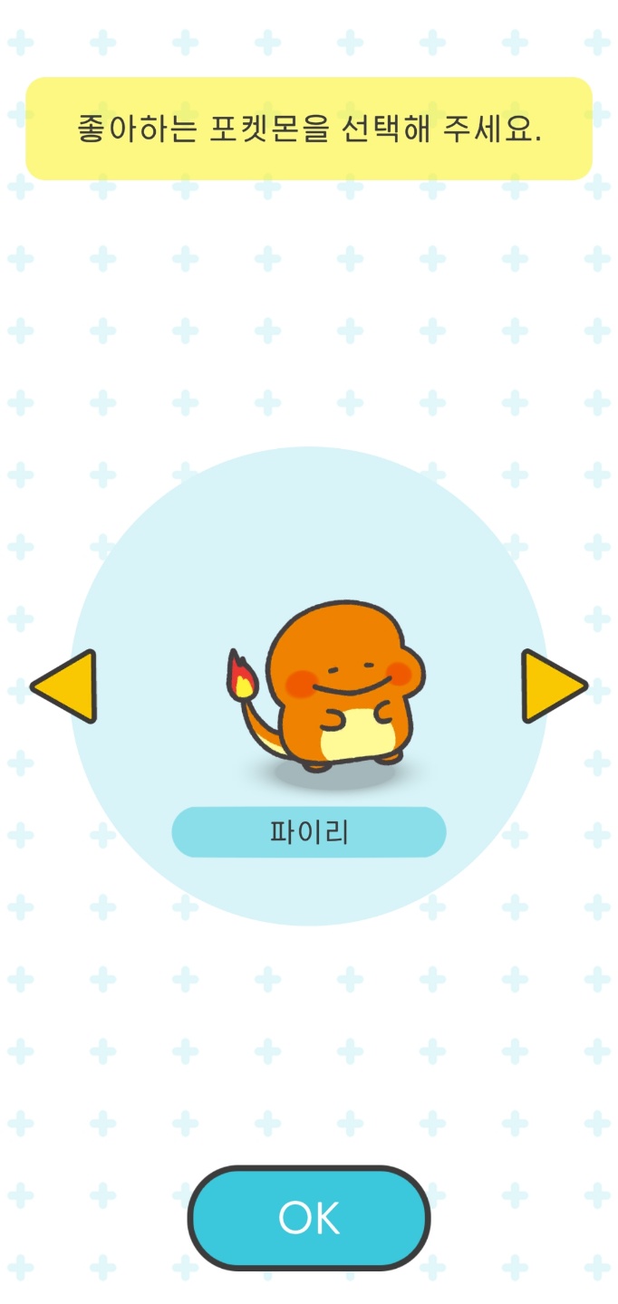 캐릭터 선택에서 피카츄, 이상해씨, 파이리, 꼬부기, 이브이 다섯개의 캐릭터 중 하나를 선택 할 수 있습니다. 아이가 좋아한는 캐릭터로 선택하면 되겠죠?
