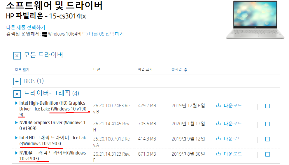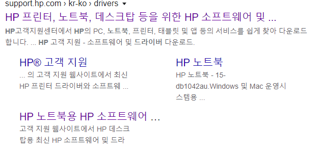 "HP 노트북 드라이버"라고 검색하면 뜨는 HP 홈페이지로 접속합니다. 그러면 노트북 모델명 혹은 일련번호를 검색하시면 노트북에 맞는 드라이버 및 유틸리티 목록이 쭉 나옵니다.