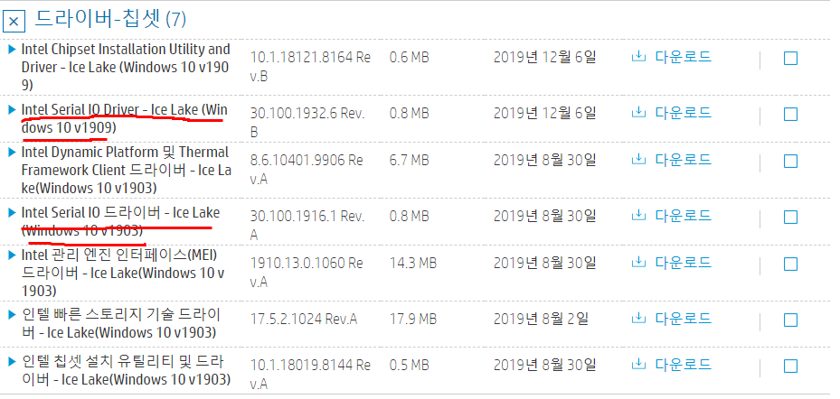 본론으로 돌아가 10세대 노트북에서 터치패드가 드라이버를 설치했음에도 불구하고 먹통이 되는 경우가 있다는 사실을 검색을 통해 알게 되었고, 이 드라이버 저 드라이버 다시 설치하던 중 평소에는 잘 설치하지 않던 인텔 serial io 드라이버를 설치하고 난 뒤 터치 패드가 정상 작동함을 알게 되었습니다. 보통 serial io 드라이버의 경우 PC에서는 거의 설치하지 않는 경우가 많았으며, 10세대 이전 노트북에서 또한 마찬가지였습니다. 그리고 검색 결과 HP뿐만 아니라 삼성 노트북에서도(10세대 탑재 모델) 윈도우 버전 1909를 설치했을 때 Serial io 드라이버를 잡기 전에는 터치패드가 먹통인 경우가 생긴다고 합니다.