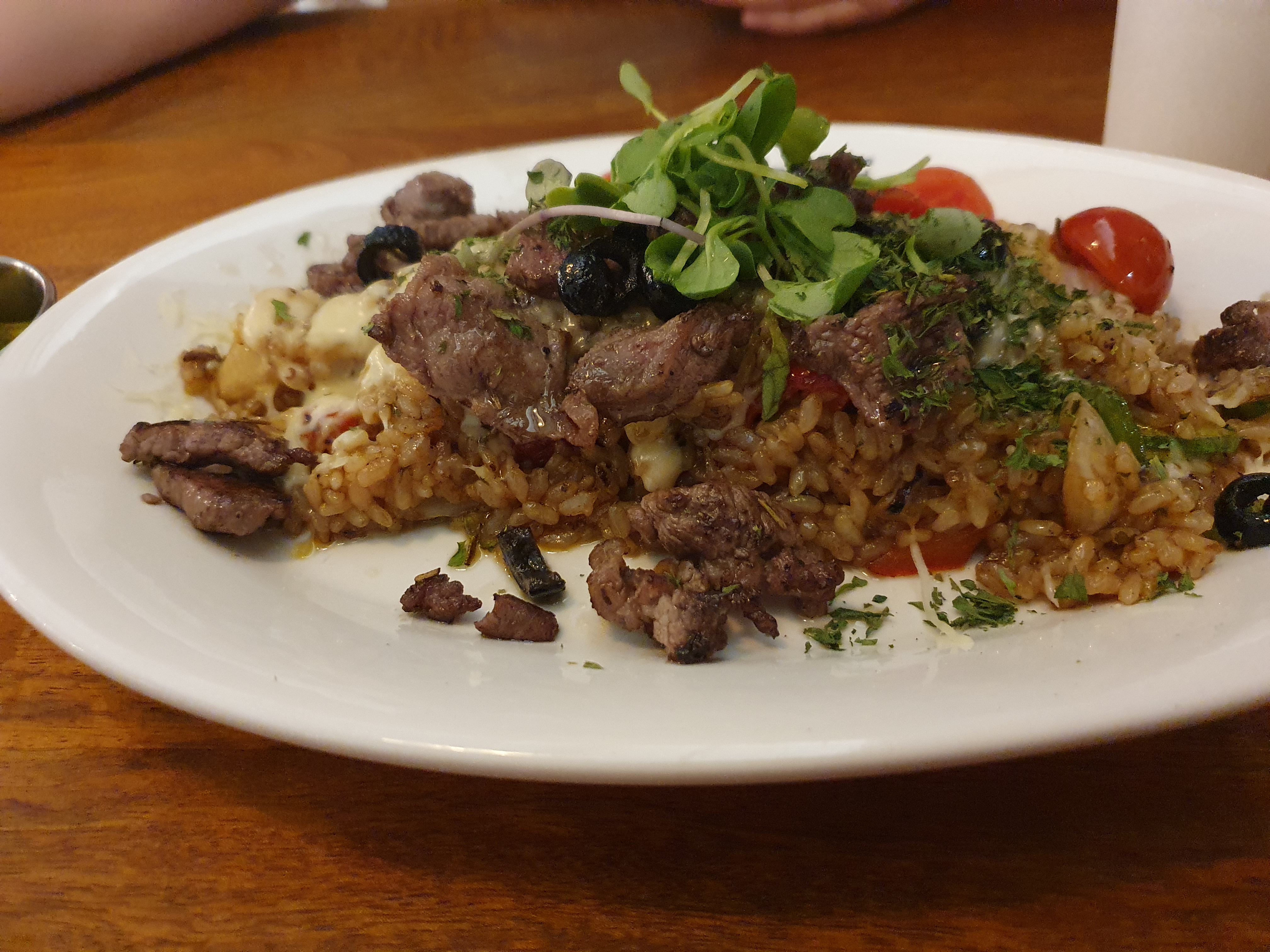 대표메뉴인 10불 스테이크와 고르곤 졸라 피자, 그리고 큐브 스테이크 필라프, 음료는 청포도 에이드와 어린이 쥬스로 시켰습니다.