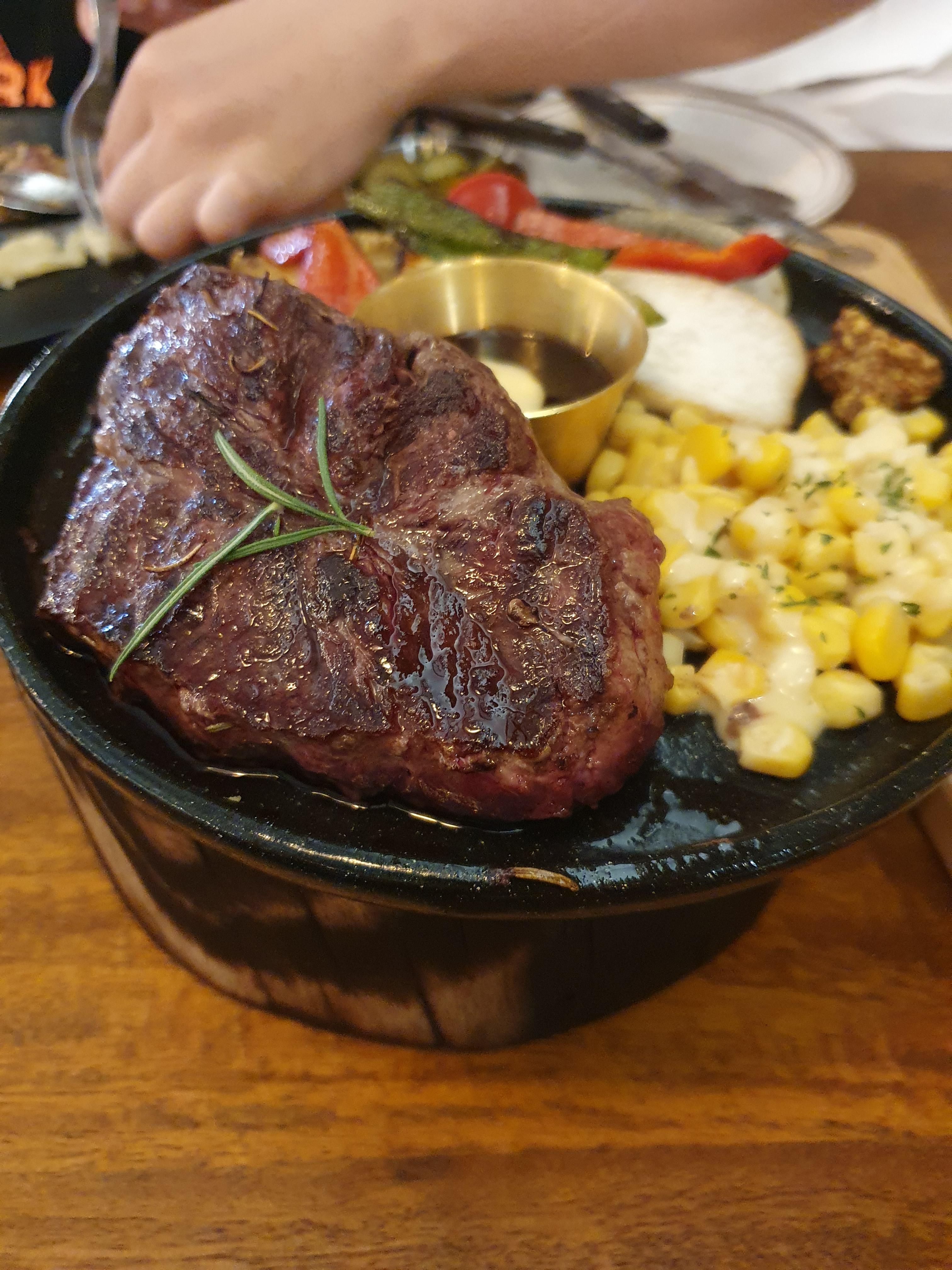 아이와 같이 드신다면 스테이크도 바짝 익혀달라고 하시는게 좋을 것 같습니다. 스테이크를 자르고 나니 안쪽은 미디엄 웰던 정도로 붉으스름했기 때문에 어린 아이들은 살짝 거부감이 생길 수 있을 것 같아요.