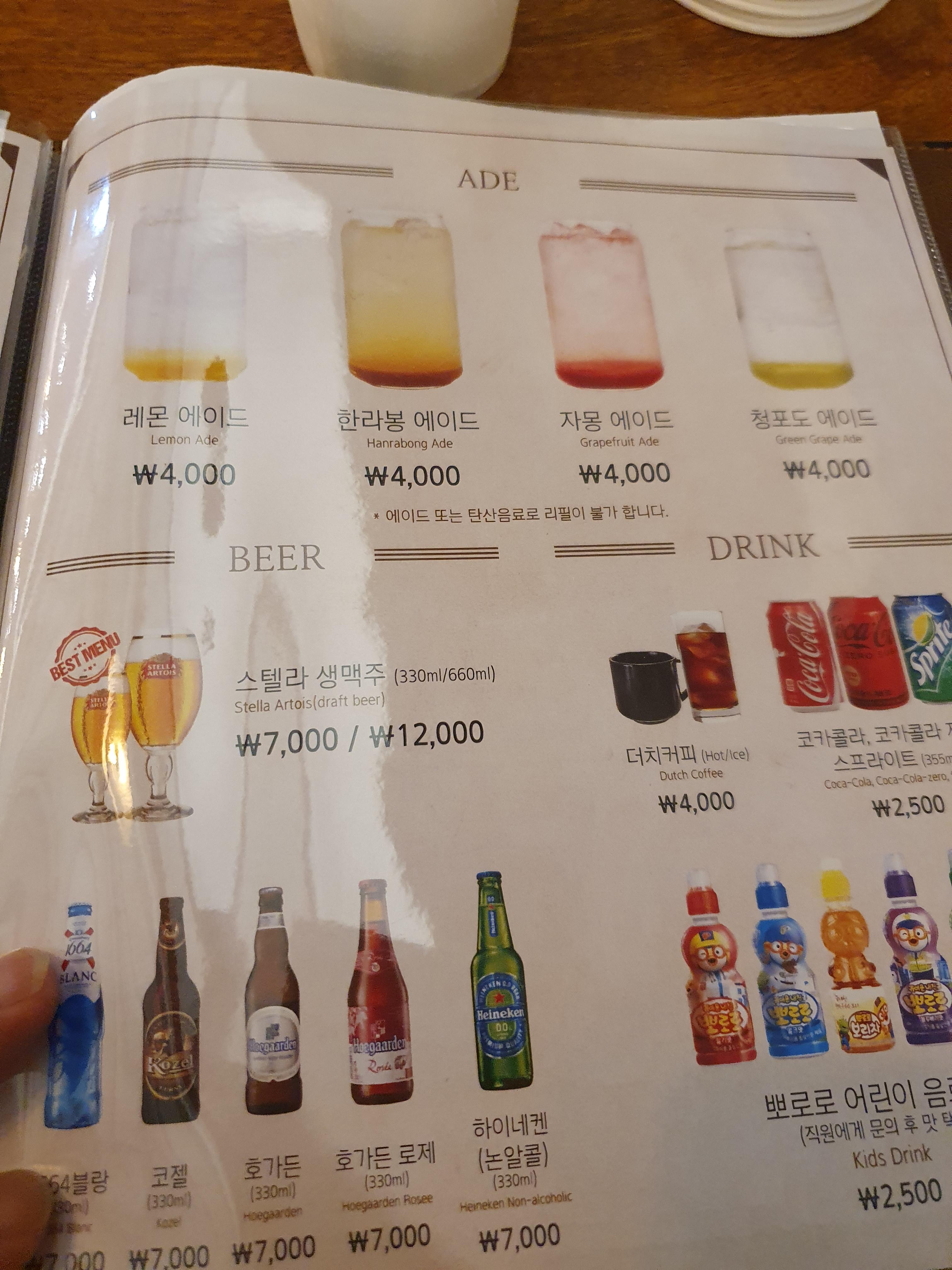 여러 종류의 에이드와 맥주, 탄산음료, 그리고 어린이 쥬스도 구비되어 있습니다.
