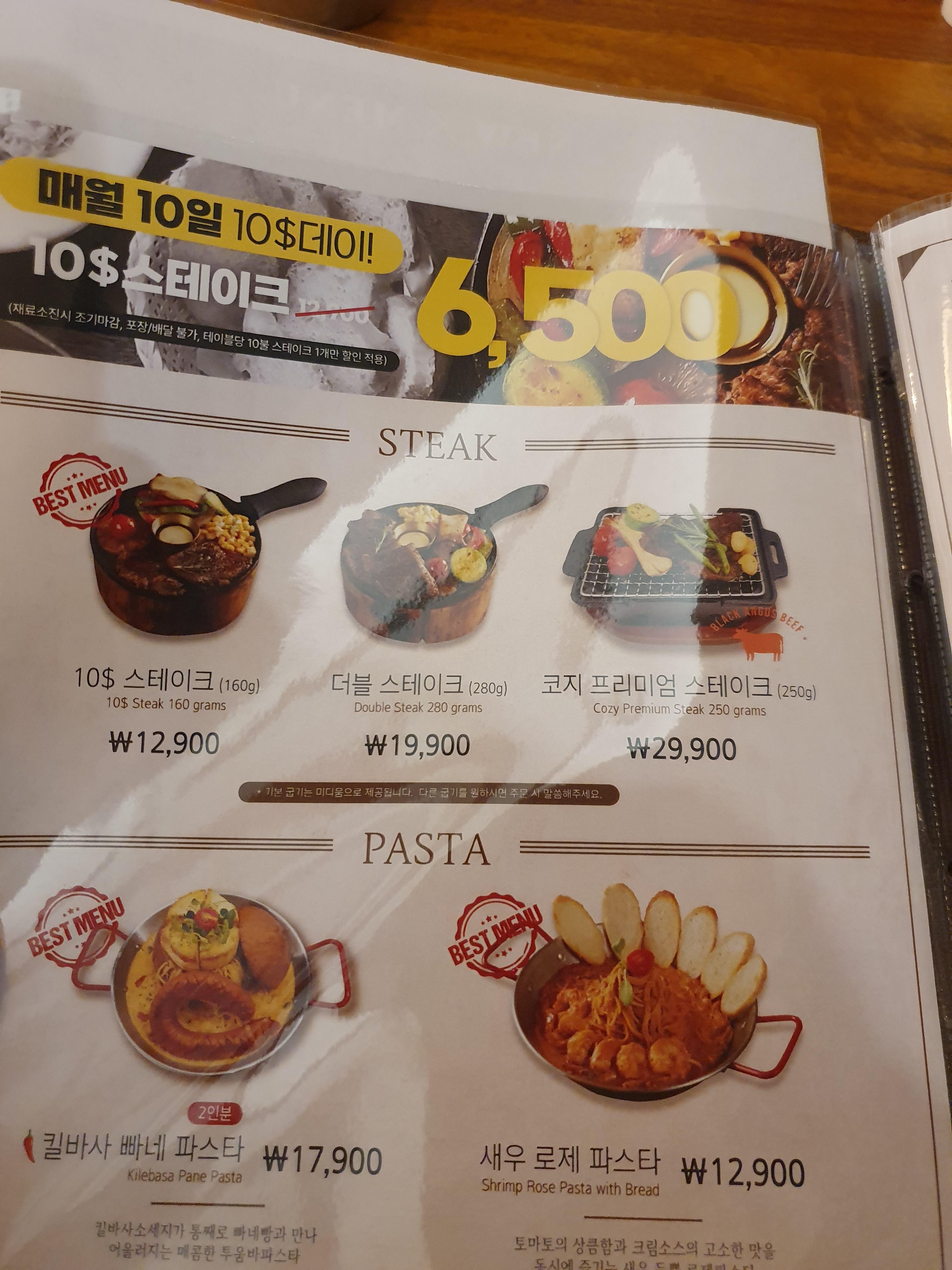 대표메뉴인 10달러 스테이크 입니다. 매월 10일은 반값 행사를 한다니 참고하시면 좋을 것 같습니다.