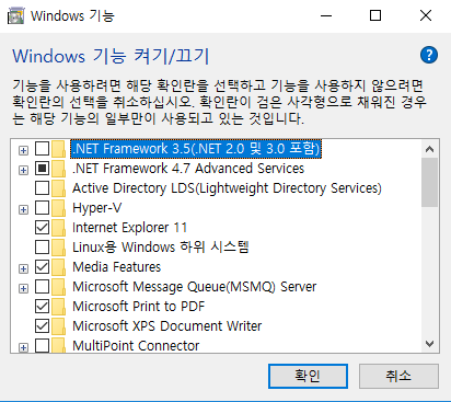 이렇게 넷프레임워크 3.5항목이 체크 해제가 되어있는데 체크를 해주시면 설치 진행이 됩니다.