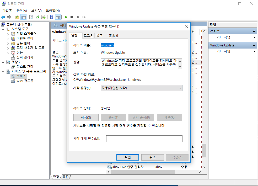이때 주의 하실점은 컴퓨터 관리에서 windows업데이트 항목이 수동이나 자동으로 실행으로 선택 되어 있어야됩니다.