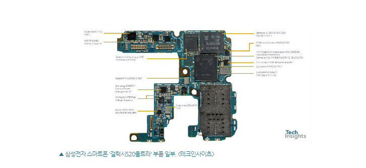 '갤럭시 S20 울트라에는 퀄컴의 AP(CPU쯤으로 생각하시면 좋을 듯 합니다.) 스냅드래곤865가 탑재되어있다. 다만 인도 등 일부 국가에서 출시되는 갤럭시S20모델(SM-G988D/DS)모델은 삼성전자 자체 AP인 엑시노스 990을 탑재 하는 것으로 알려졌다. 이미지 센서는 픽셀피치 0.7㎛급 제품이 사용 되었는데 이는 삼성전자가 최근 양산을 시작한 아이소브라이트 제품으로 알려졌다. 메모리는 삼성전자의 D램 LPDDR5가 적용됐다' 라고 했으며 이 밖에 배터리, 디스플레이등 모든 부품의 가격을 더하면 갤럭시 S20울트라의 부품 원가가 528.5달러에 달한다라고 말했습니다.