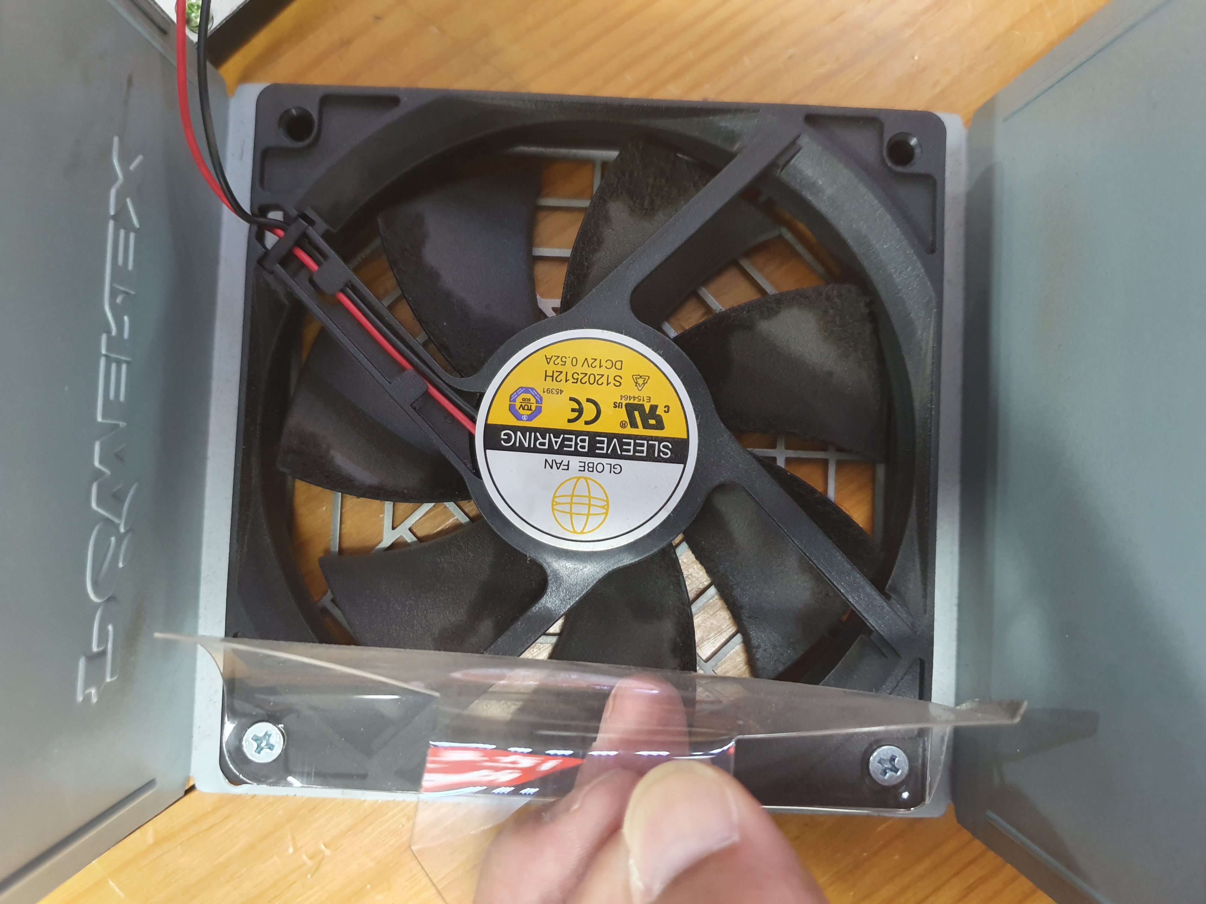 나사를 불어서 분해해주시면 스티커가 붙어 있는 쪽이 나옵니다. 스티커에도 슬리브 베어링이라고 적혀있네요. 제품이 처음 나올 때 뿌려져 있는 윤활유도 워낙 열에 약하기 때문에 금방 말라서 소리가 나는 경우가 많다고 합니다. 파워서플라이나 그래픽카드 팬에 많이 사용되는 방식은 슬리브 베어링 방식인데, 이물질이 들어가는 현상 때문에 아예 사출식으로 만들어버리는 경우도 있습니다. 그렇게 되면 저렇게 베어링 중간에 회전축에 윤활유 넣을 공간도 없어서 사출 된 경우에는 답이 없다고 합니다.