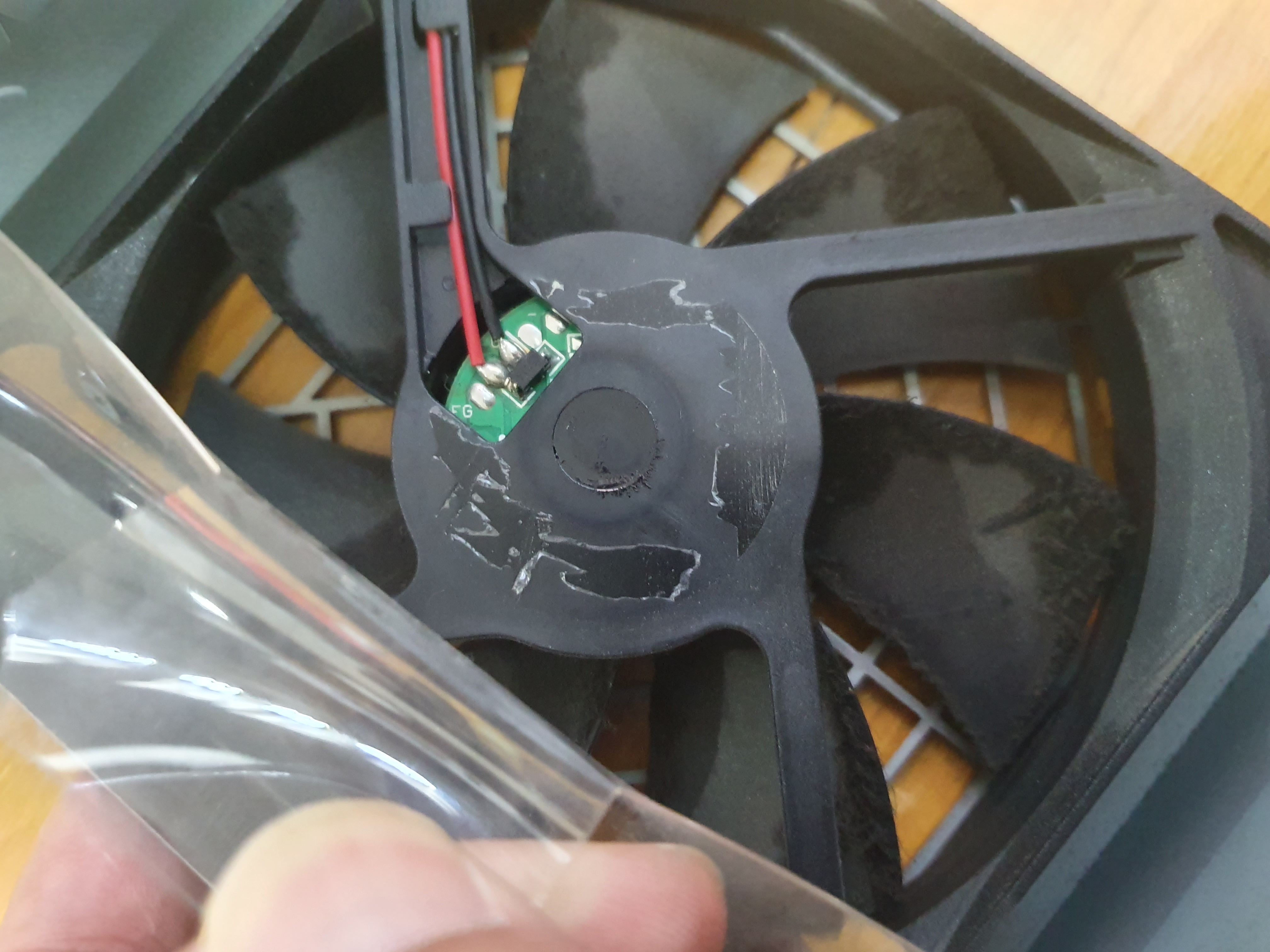 이렇게 제쳐주면 베어링 회전축 공간이 나옵니다. 저 공간에 베어링 오일을 한 두 방울 떨어뜨려주고 다시 스티커로 덮어줍니다. 그러면 작업 완료! 분해한 김에 팬 쪽에 붙어있는 먼지도 제거해줍니다.