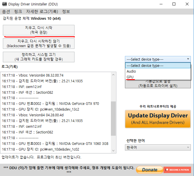 이미지 오른쪽에 장치 타입을 고르는 부분에서 GPU를 고르시고 지우고, 다시 시작 옵션을 선택해주세요. 그러면 윈도우10에서 기본으로 설치된 드라이버가 지워지고 컴퓨터가 재부팅된답니다.