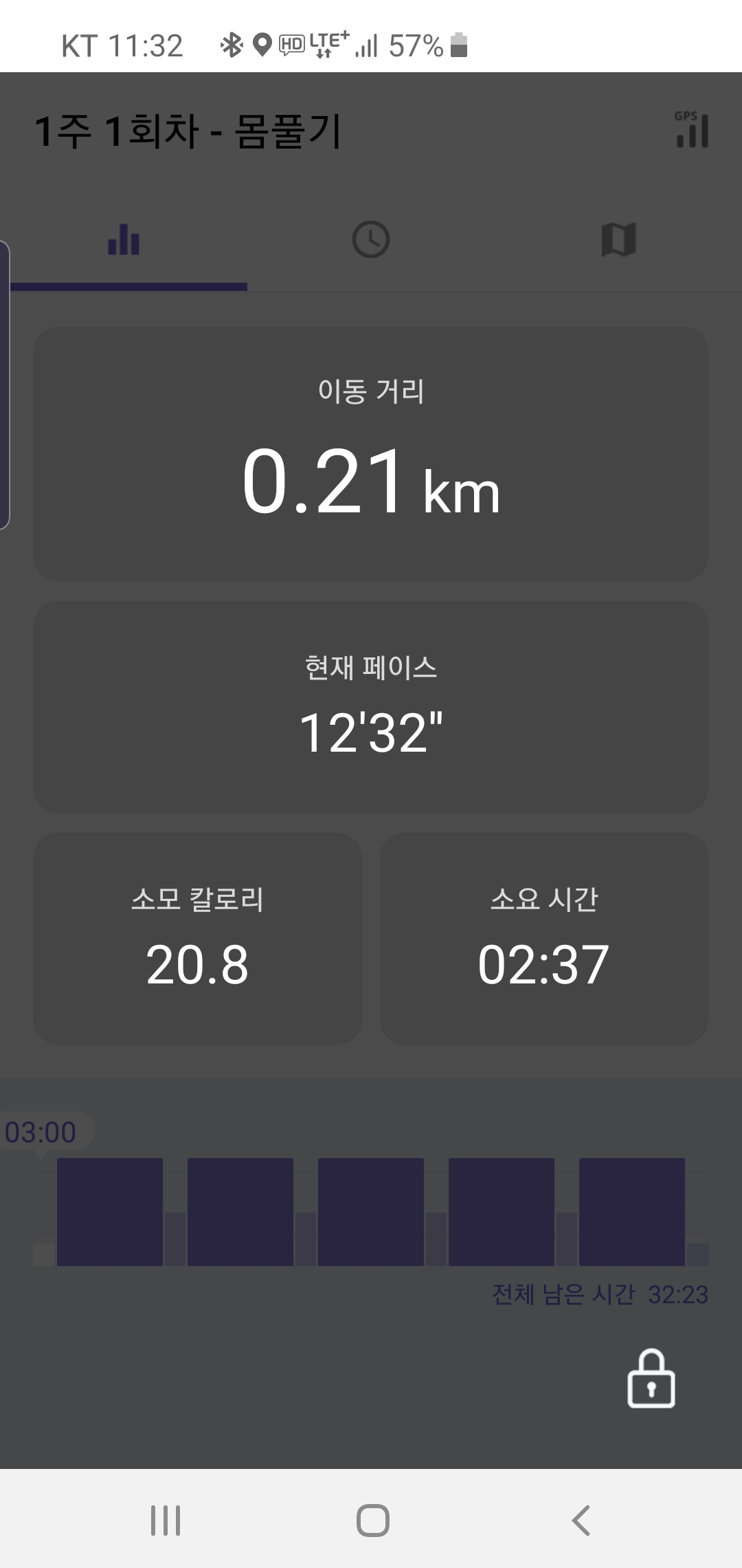운동을 시작하고 자물쇠 표시를 눌러서 화면 잠금 해주시면 화면 터치가 안되기 때문에 잘못된 터치를 하는 것을 방지 할 수 있습니다. 화면 하단에는 운동 남은 시간 그리고 워밍업 시간 달리는 시간이 표시됩니다. 그리고 중간중간에 어플 자체 AI가 지루하지 않게 꾸준히 달릴 수 있는 방법. 달리기의 장점등 여러 가지 팁을 음성으로 말해줍니다. "힘내세요!"라고 응원도 해주네요.