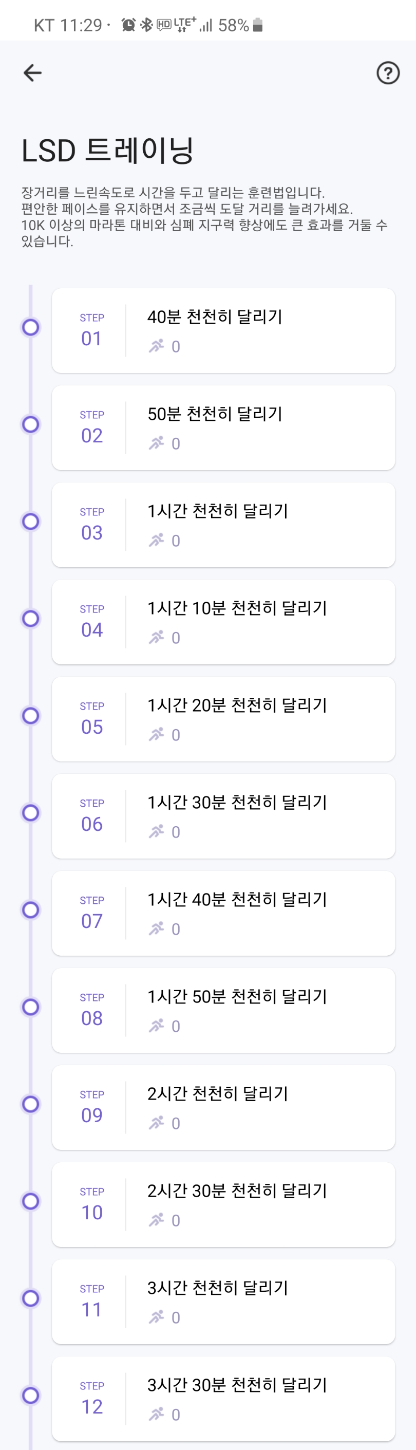 메인화면 구성은 30분 달리기, 인터벌 트레이닝, LSD트레이닝으로 구성 되어있습니다. LSD 트레이닝은 10km 이상 장거리를 달리고 싶은 분들에게 적합한 트레이닝이라 합니다.