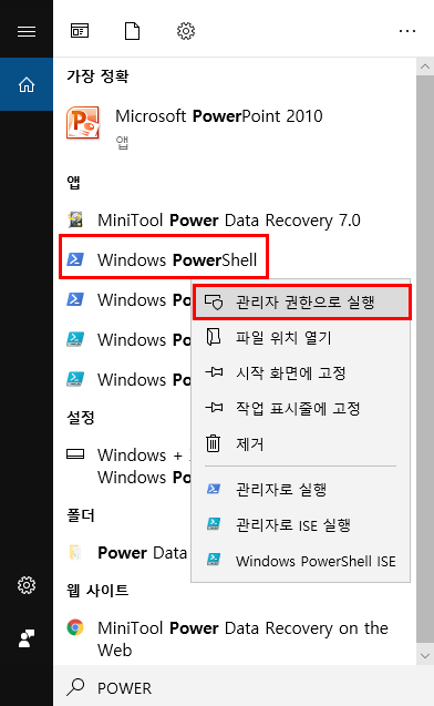 먼저 WINDOWS POWERSHELL을 찾아서 관리자권한으로 실행해줍니다.