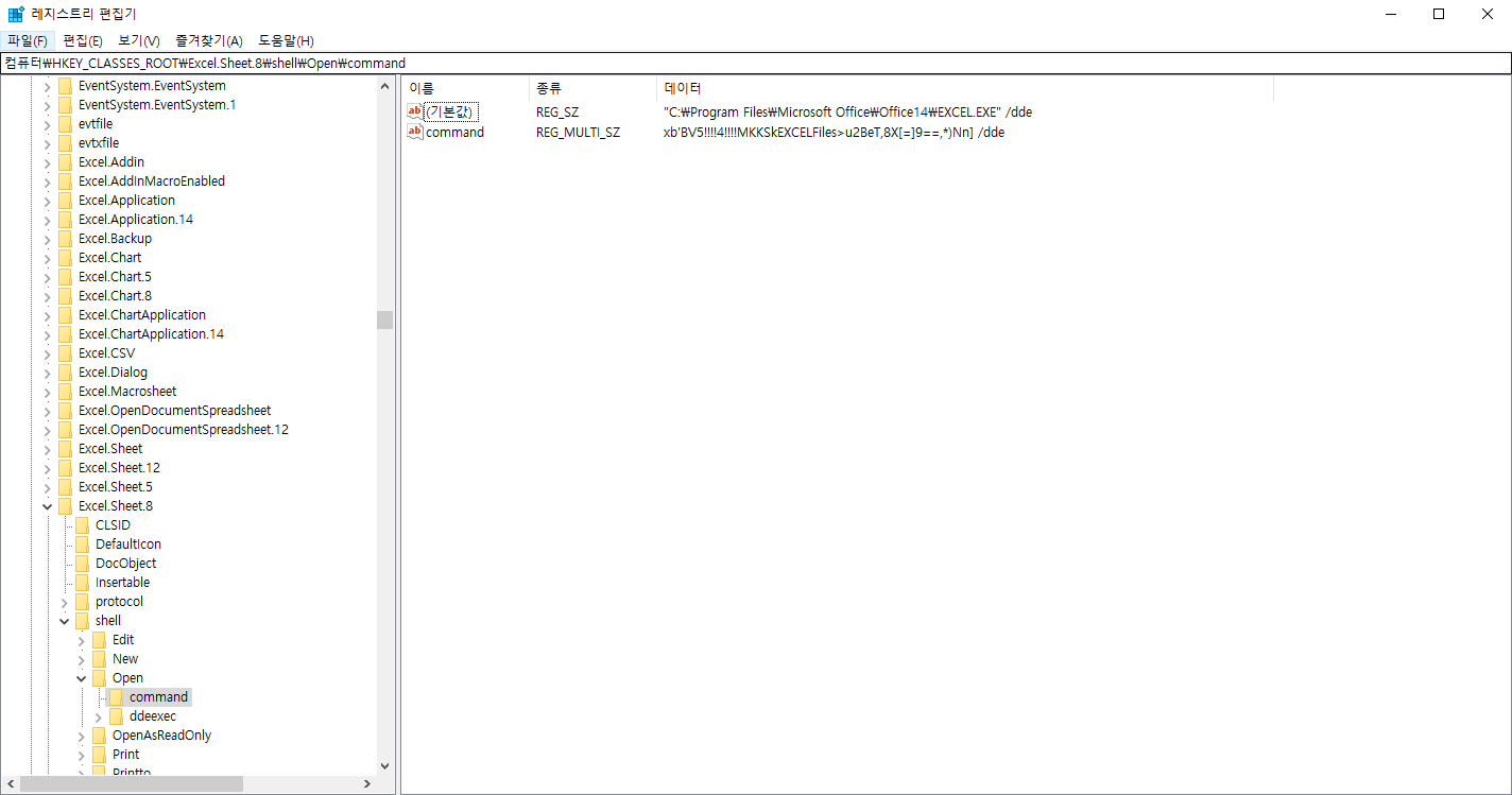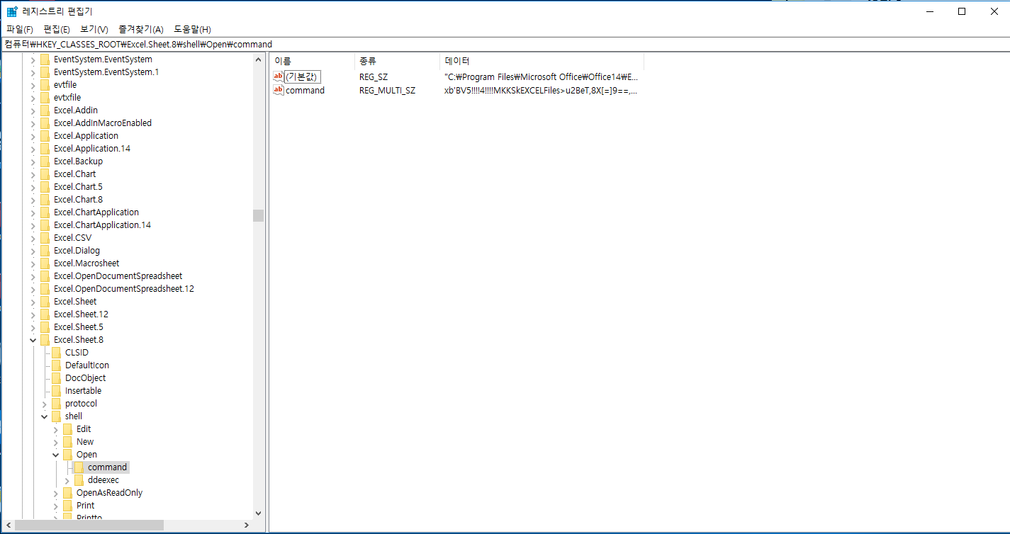 2. 컴퓨터\HKEY_CLASSES_ROOT\Excel.Sheet.8\shell\Open\command 경로를 찾아줍니다.