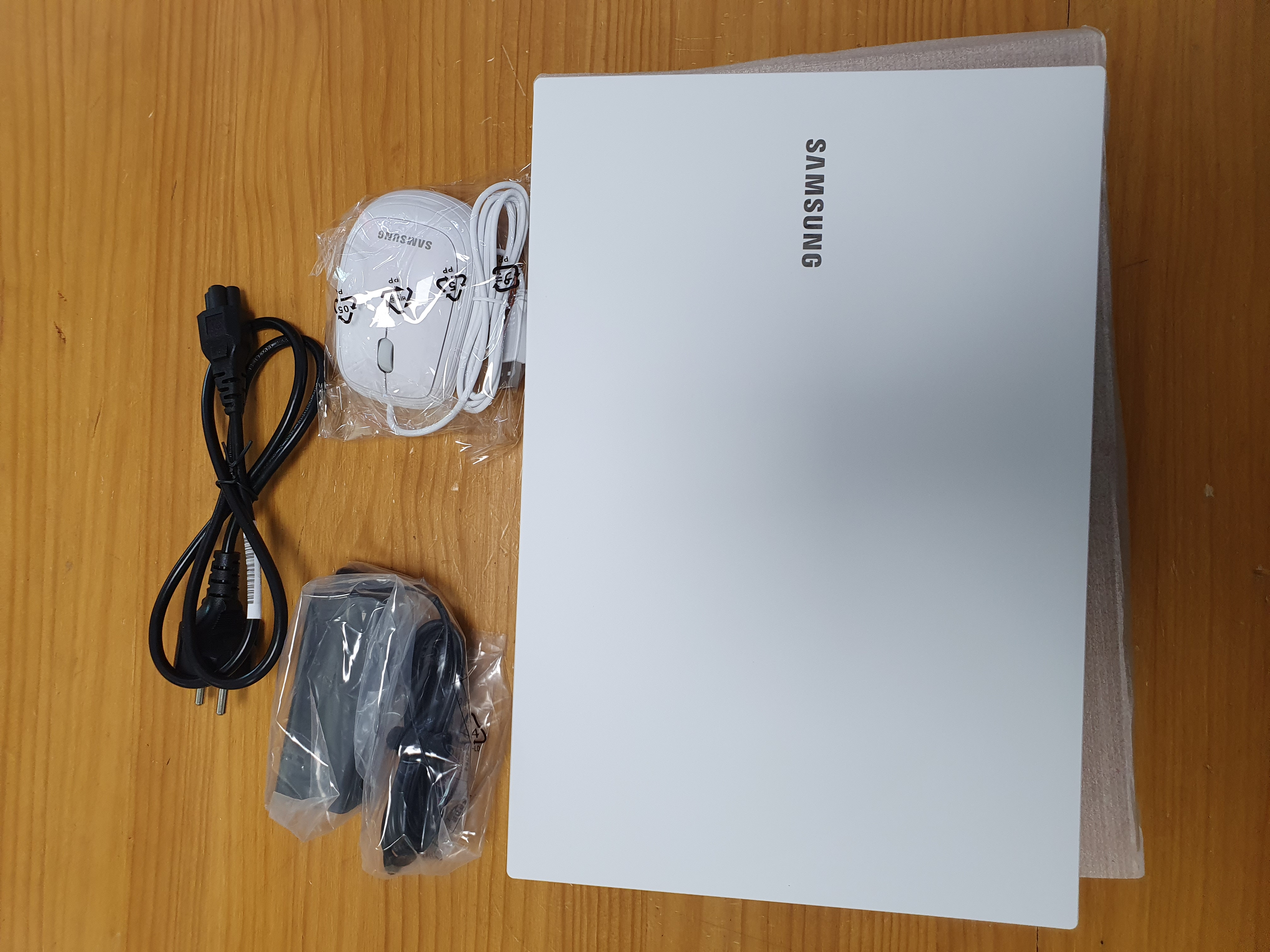 박스 안의 구성품인데요, 노트북과 어댑터, 그리고 유선 마우스 이렇게 들어 있습니다. 심플한 구성입니다. 노트북 가방은 미포함이기 때문에 필요하신 분들은 별도로 구매하셔야겠네요 :)