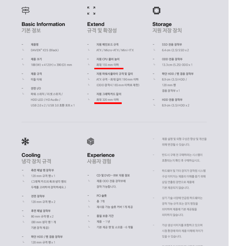 아이시스는 길이 320mm 그래픽카드와 cpu쿨러는 높이 155mm까지 지원합니다. 수냉 쿨러 장착은 라디에이터 장착할 위치가 없기 때문에 불가능합니다.