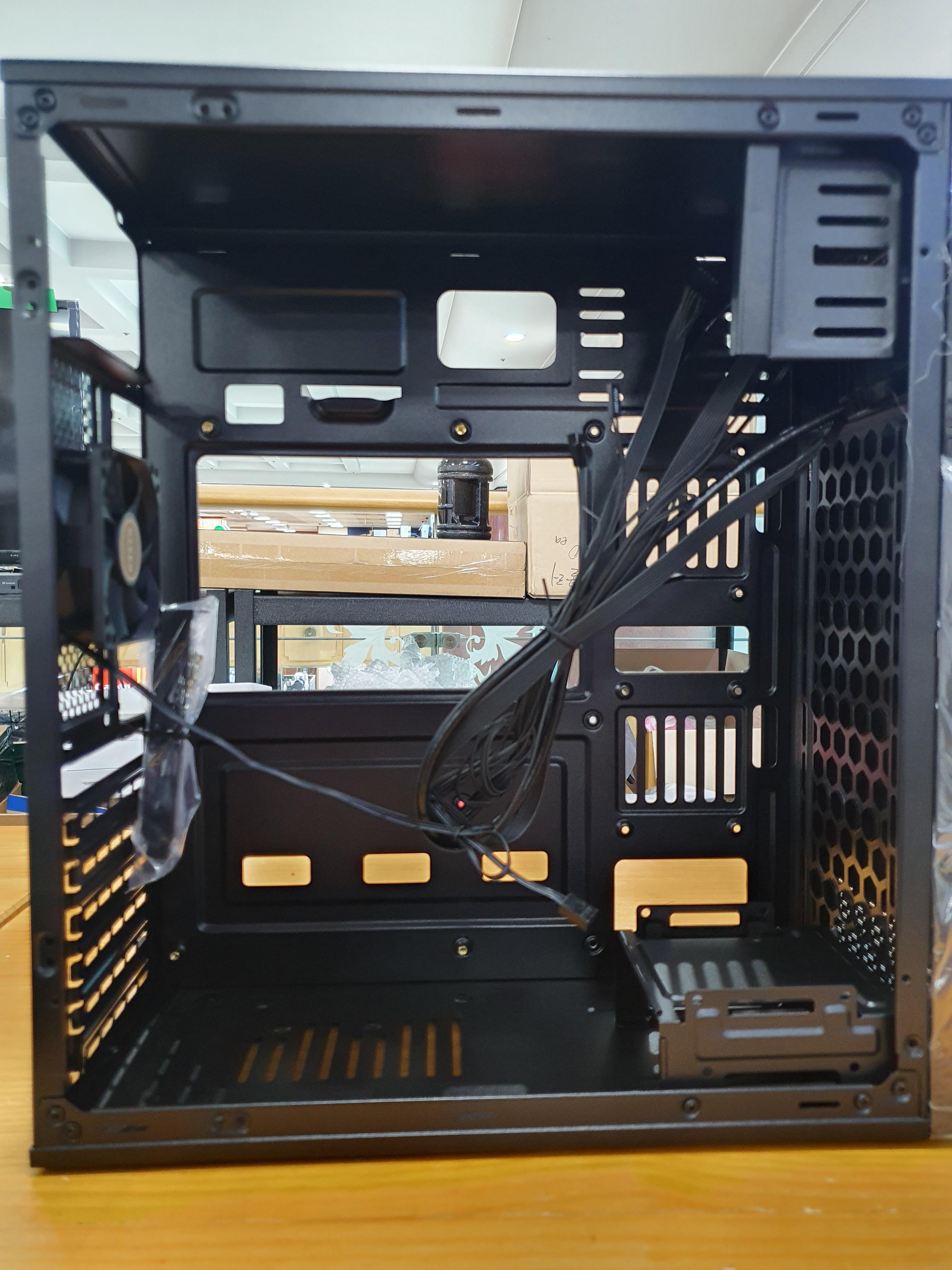 개봉 후 내부 모습입니다. 후면에 80mm팬 하나만 달려 있습니다. 케이스 금액이 상대적으로 저렴하다 보니 케이스 재질이 튼튼하다던지 이런 모습은 찾아볼 수 없습니다. 그야말로 기본 중의 기본 케이스라 볼 수 있겠네요.
