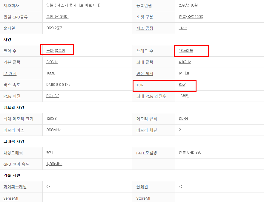 i7-10700은 8코어 16쓰레드 제품입니다. 이는 AMD의 3700X의 코어와 쓰레드 갯수와 같습니다. 그리고 열 설계 전력이 65W 입니다. 이 말은 AMD보다 상대적으로 열을 식히는데 전력 소모가 적은 쿨러가 필요하다는 말입니다. 그런데 커뮤니티를 찾아보면 게임이나 그래픽작업 혹은 랜더링 작업시 생각보다 온도가 많이 올라서 고사양의 쿨러가 필요하다는 말이 많습니다. 9세대 부터 발열 부분은 항상 아쉬운 부분 같습니다.
