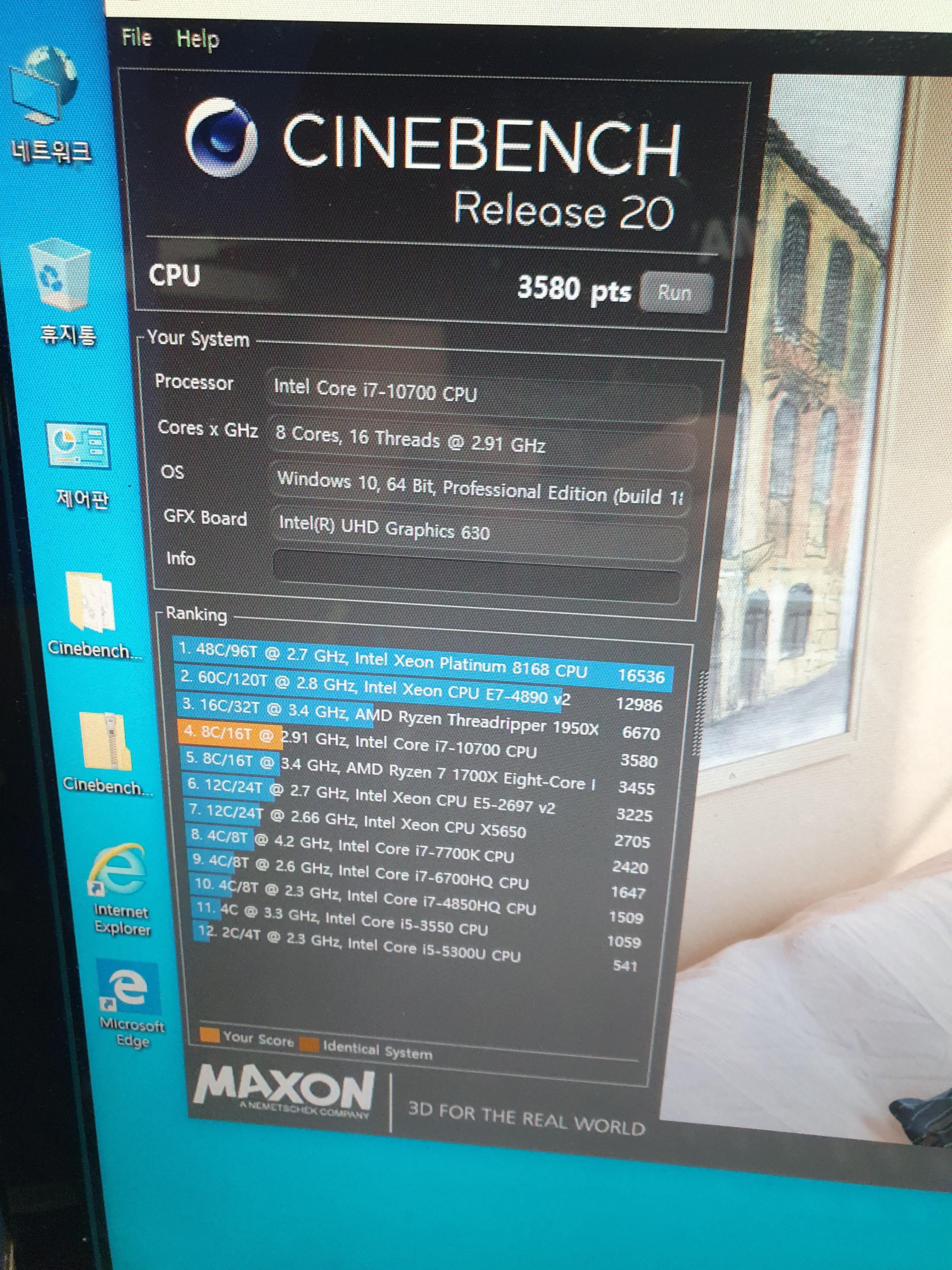 시스템 구성은 간단하게 i7-10700과 삼성램 8gb-21300, 그리고 메인보드는 애즈락 b460m-pro4, 그리고 ssd는 삼성 evo 860 250gb에 윈도우10 (1909버전)을 설치 하고 씨네벤치 테스트를 진행했습니다.
