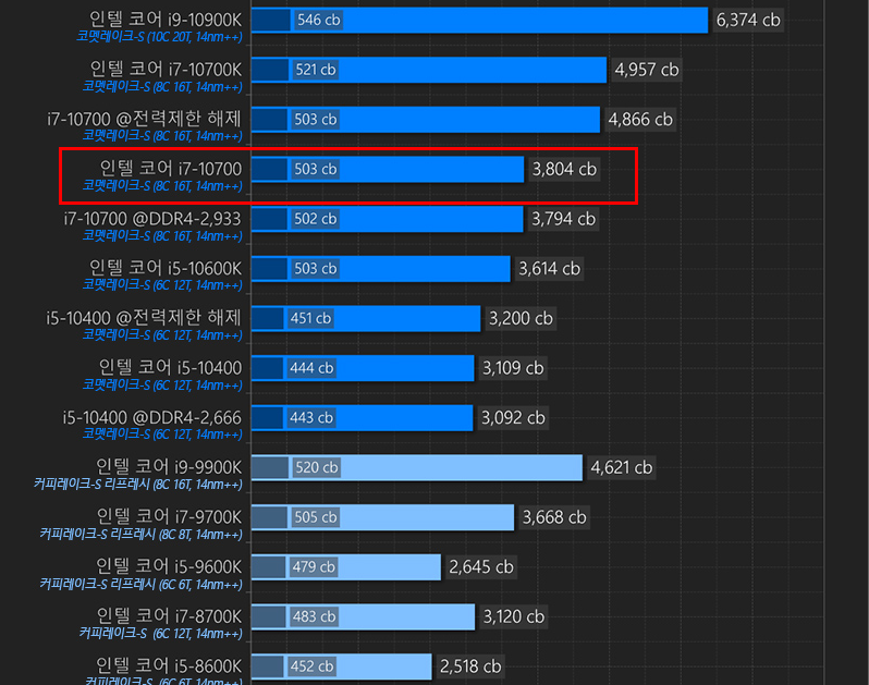 AMD라인업에서는 3700X와 비교하시면 적당 할거라 생각합니다. 3700X의 씨네벤치 점수는 4850으로 전력해제를 한 10700과 비슷한 점수를 보여줍니다. 하지만 전력해제를 하기전에는 3700X보다 하위 모델인 3600X정도의 성능을 보여주기 때문에 약간은 실망스러웠습니다.