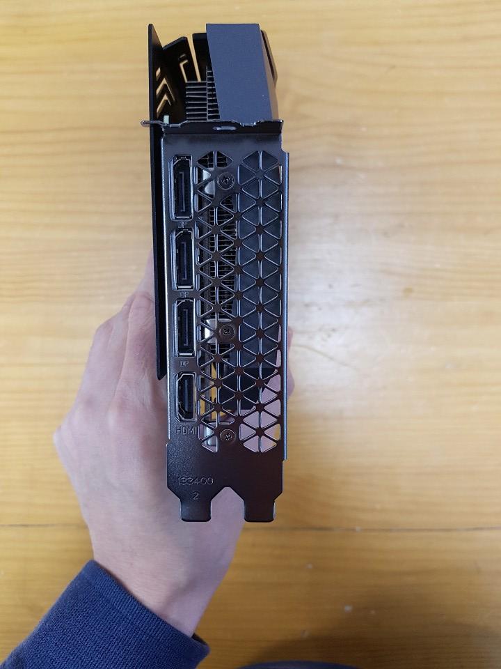 드디어 그래픽카드를 꺼냈는데 생각보다 바디가 훨씬 짧다는 생각이 들었습니다. 조택 엣지 3070모델에는 DVI포트가 없이 DP포트 3개와 HDMI포트 1개로 포트 구성이 되어있습니다. 요즘 HDMI를 많이 쓰신다지만 DVI케이블을 쓰시던 분들은 땀나는 경우가 발생할수도 있겠네요.