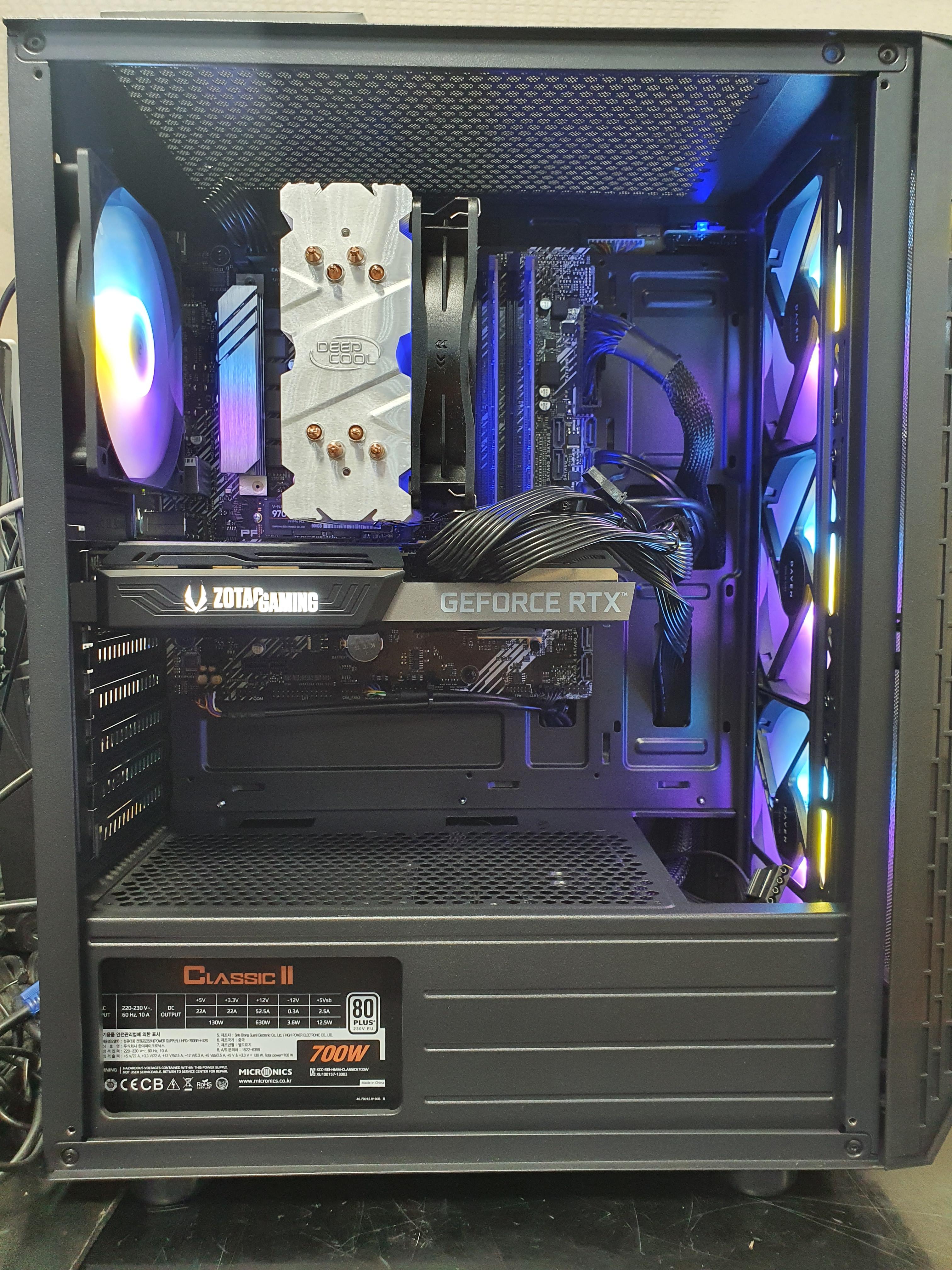i7-10700f/아수스 프라임 b460m-a/ 삼성 ddr4 32gb 25600클럭/ 삼성 970evo 500gb/마이크로닉스 클래식2 700/ 딥쿨 갬맥스400 공랭쿨러/조택 3070이렇게 구성되어 있습니다.